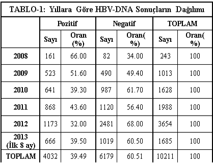 | Bulgular: 2008 yılı başından, 2013 yılı Ağustos ayı sonuna kadar olan sürede, laboratuvarlarımızda 10.211 HBV DNA kantitatif viral yük tayini yapılmıştır. 2008 yılında 243, 2009 yılında 1013, 2010 yılında 1628, 2011 yılında 1988, 2012 yılında 3654 ve 2013 yılı ilk 8 ayında 1685 HBV DNA testi çalışılmıştır. Pozitiflik oranları 2008’ de % 66 (161/ 243), 2009’ da % 51.6 (523/ 1013), 2010’ da % 39.3 (641/ 1628), 2011’ de % 43.6 (868/ 1988), 2012’ de % 32 (1173/ 3654) ve 2013’ün ilk 8 ayda % 39.5 (666/1685) |